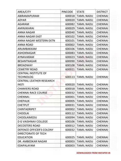 chennai pincode list with area name in excel