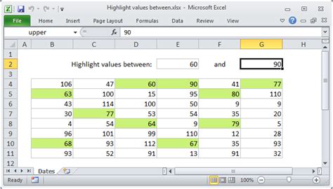 formula to highlight cells between two values